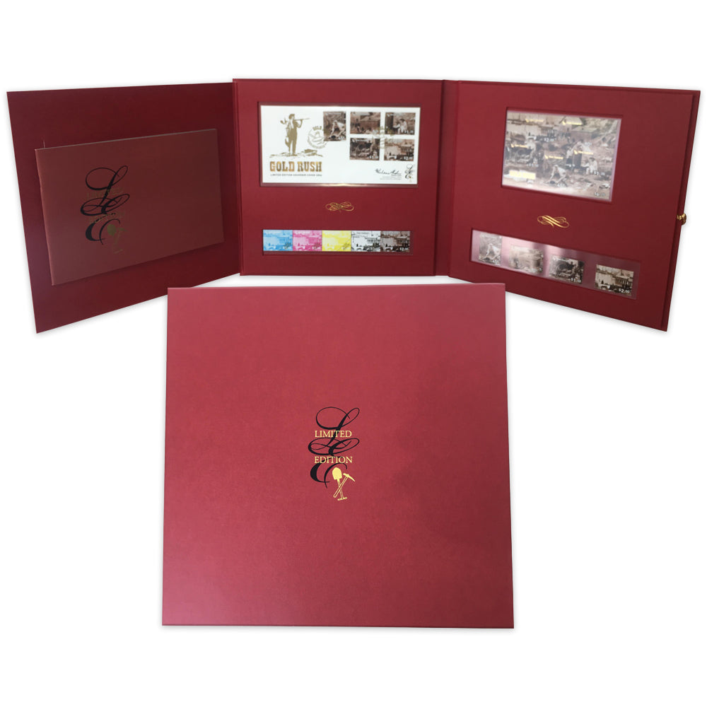 Limited Edition hardback Pack featuring the Gold Rush stamp issue of September 2006. Contains a unique, individually numbered imperforate foiled miniature sheet and is the only way to obtain the stamps in this format. Also includes a certificate of authenticity, a signed First Day Cover and various other formats of the stamp set including a very unusual colour separation strip for the $2 stamp (only available in this pack), plus a book which tells the story of The Gold Rush written by Melanie Nolan, Associate Professor of History at Victoria University, Wellington, NZ who has signed the FDC.The 45c stamp marks a first for NZ Post - it is printed with thermographic ink, when heated reveals the gold nuggets. Supplied in sturdy slip case. A hand numbered series, with a limited edition of 2,000.