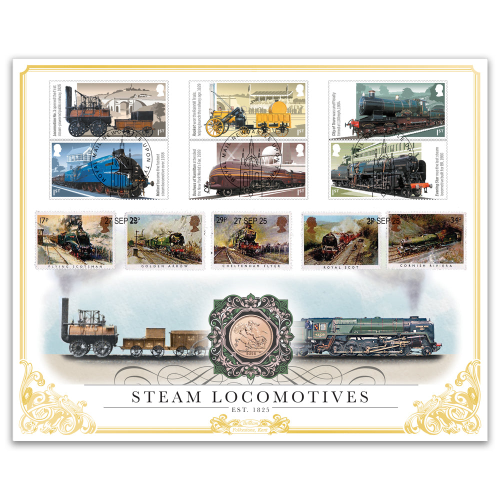 Such a momentous event deserves a significant celebration and our prestigious sovereign cover does that. It contains a 2025 gold sovereign flanked by images of Locomotion No.1 and Evening Star. The Royal Mail 2025 special stamp issue is accompanied with the 1985 Famous Trains stamp issue and both are cancelled with a Newcastle postmark for the location of the journey. Issued in a hand numbered edition of just 50.