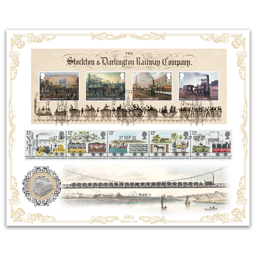 This special coin cover encapsulates the new Royal Mint £2 coin celebrating the event in uncirculated condition. The cover bears the 2025 Royal Mail miniature sheet that features Locomotion No.1 and the historic journey and is cancelled with a Newcastle postmark for the location of the journey. The cover is enhanced with the 1980 150th Anniversary of Liverpool and Manchester Railway issue that features The Rocket. A superb cover. Issues in a hand numbered limited edition of just 50.