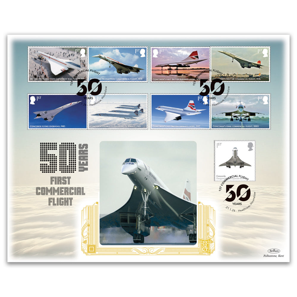 Royal Mail are celebrating 50 years since Concorde's first commercial flight with a set of eight stamps. The stamps, all 1st class, feature photographs of Concorde throughout its history: British Pre-Production Concorde Rolled Out, 1971; British Pre-Production Concorde In Flight, 1974; Concorde's First British Airways Livery, 1974; Concorde's First UK Commercial Flight, 1976; Concorde Flying Overhead, 1985; Celebrating 10 Years of Service, 1985; Concorde's Last British Airways Livery, 1997 and Final Commercial Flight, 2003.