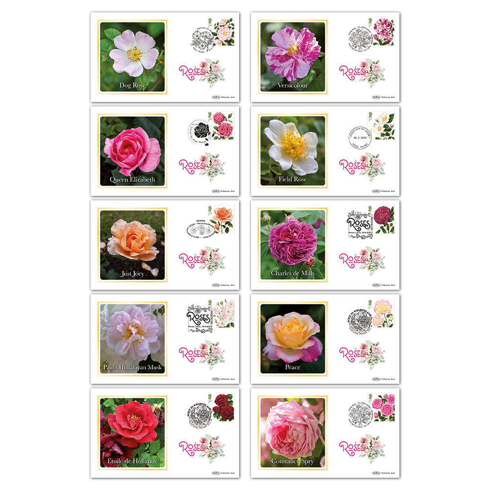 Royal Mail have released a special set of stamps celebrating the roses of the UK, marking the 100th anniversary of the birth of the pioneering British rose breeder David Austin OBE (1926-2018). The set of ten stamps, five 1st class and five 2nd class, feature watercolour paintings by artist Marie Burke. The roses featured are, 1st class: Rosa gallica, 'Versicolour'; Field Rose, Rosa arvensis; Rosa 'Charles de Mills'; Rosa 'Peace'; Rosa 'Constance Spry' and 2nd class: Dog Rose, Rosa canina; Rosa 'Queen Elizabeth'; Rosa 'Just Joey'; Rosa 'Paul's Himalayan Musk'; Rosa 'Étoile de Hollande'.
