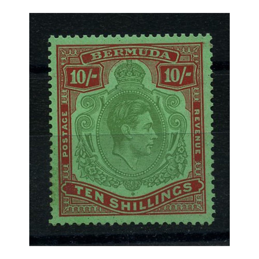 Bermuda 1938-53 10/- Bluish-green & deep-red/green chalk surf ppr, perf 14, lightly mtd mint. SG119a