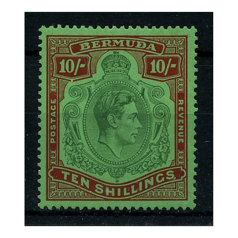 Bermuda 1938-53 10/- Green & deep lake/pale emerald, mrd mint, toned gum. SG119