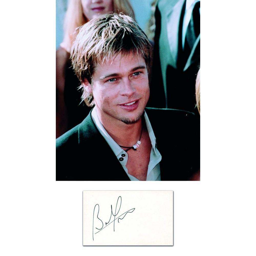 A white card signed in bold black ink by Brad Pitt, mounted together with a photograph of the popular actor. All our autographs are supplied with a Certificate of Authenticity and a Lifetime Guarantee. Size of signature: 120 x 75mm.