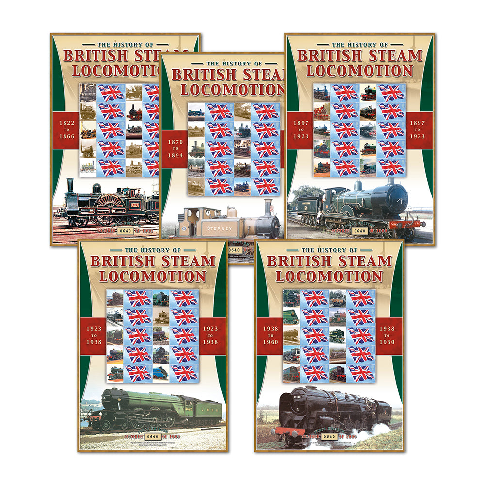 British Steam Locos Set of 5 GB Customised Stamp Sheets 1822-1960