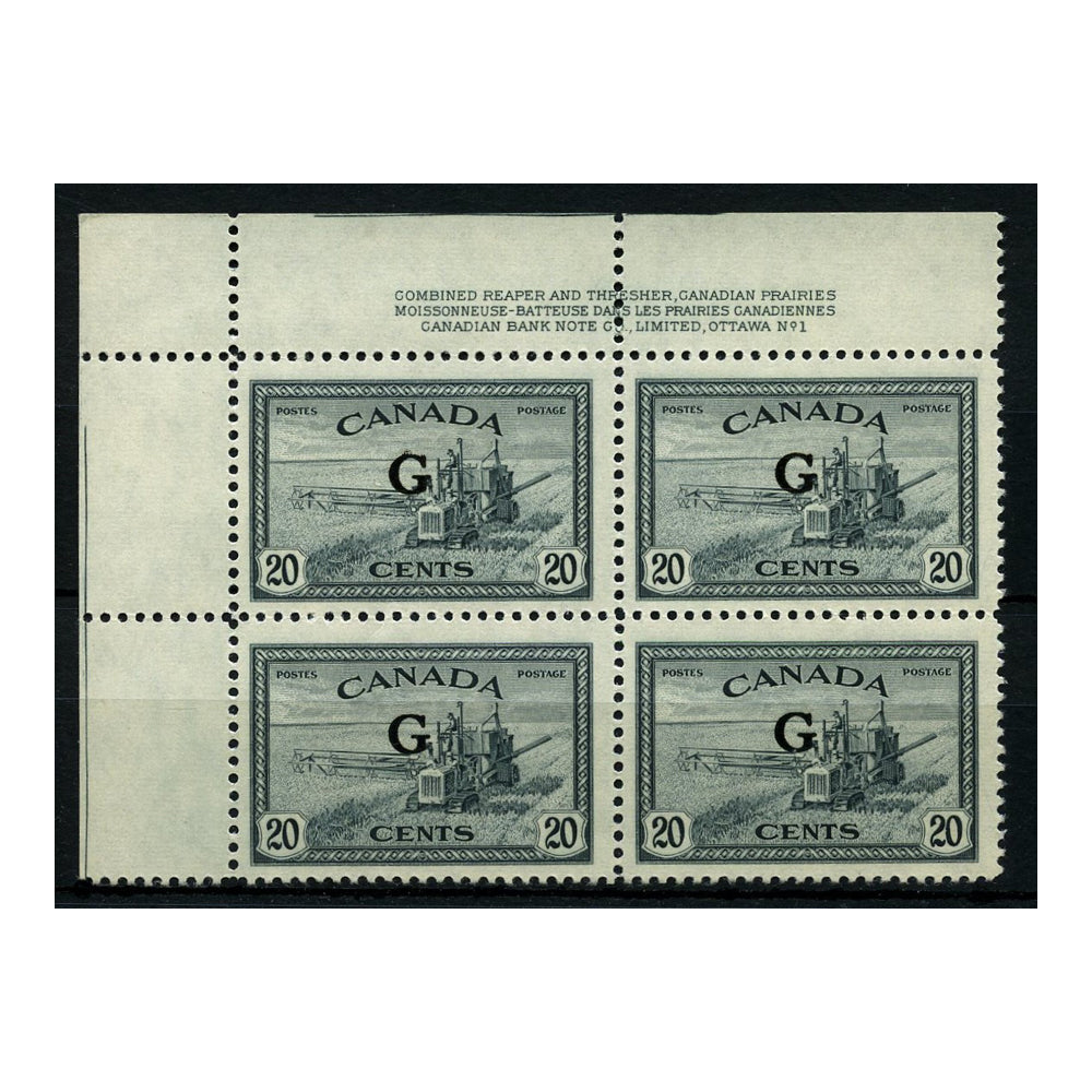 Canada 1950-1951 20c Plate block with G overprint, lightly mtd on one stamp only. SG0187