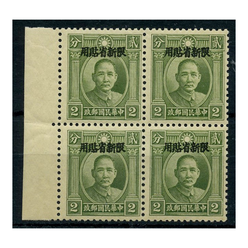 China Sinkiang 1938 2c Green, 'double ring emblem' with Shanghai ovpt, block of 4, u/m. SG94