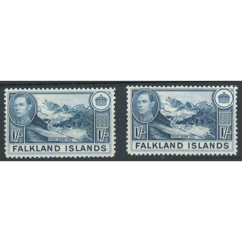 Falkland Is 1938-50 1/- Mt. Sugar, both dull greenish-blue and dull blue, fine mtd mint. SG158a+b