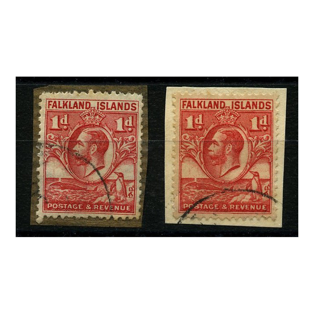 Falklands 1929-37 1d Both shades, cds used on small fragments. SG117+a