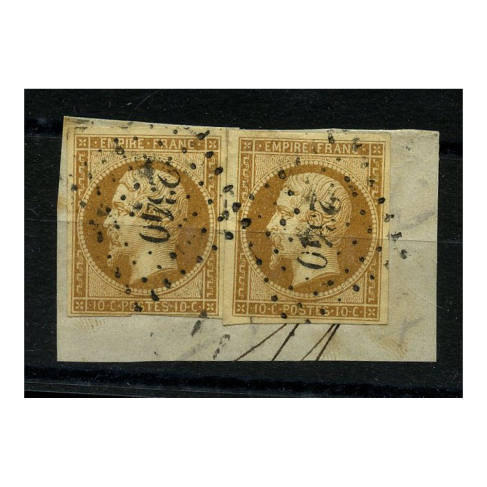 France 1861 10c Brownish-bistre/cream, 2x singles (1 superb 4 margin), fine used on fragment. SG50c
