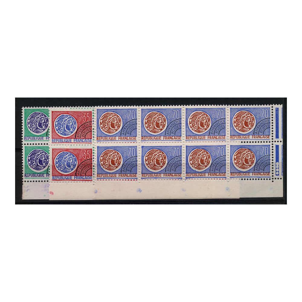 France 1969 22c, 35c, 70c Gallic coin pre-cancels (1969 values), blocks of 8, u/m. SG1647b, 47f, 48b