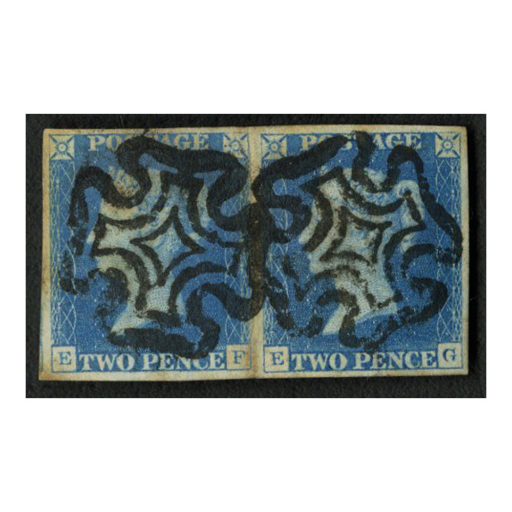 GB 1840 2d Blue, plate 2, 4 margin horiz pair, used with back MX cancels. SG5
