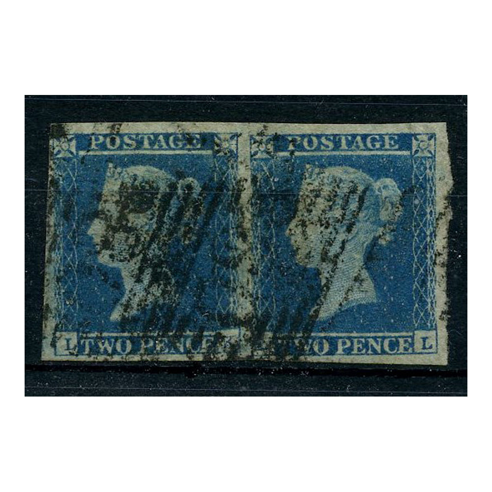 GB 1841-51 2d Deep full-blue, pl. 4, horiz pair, 4 marg, THIN PAPER, used with Irish cancels. SG15va