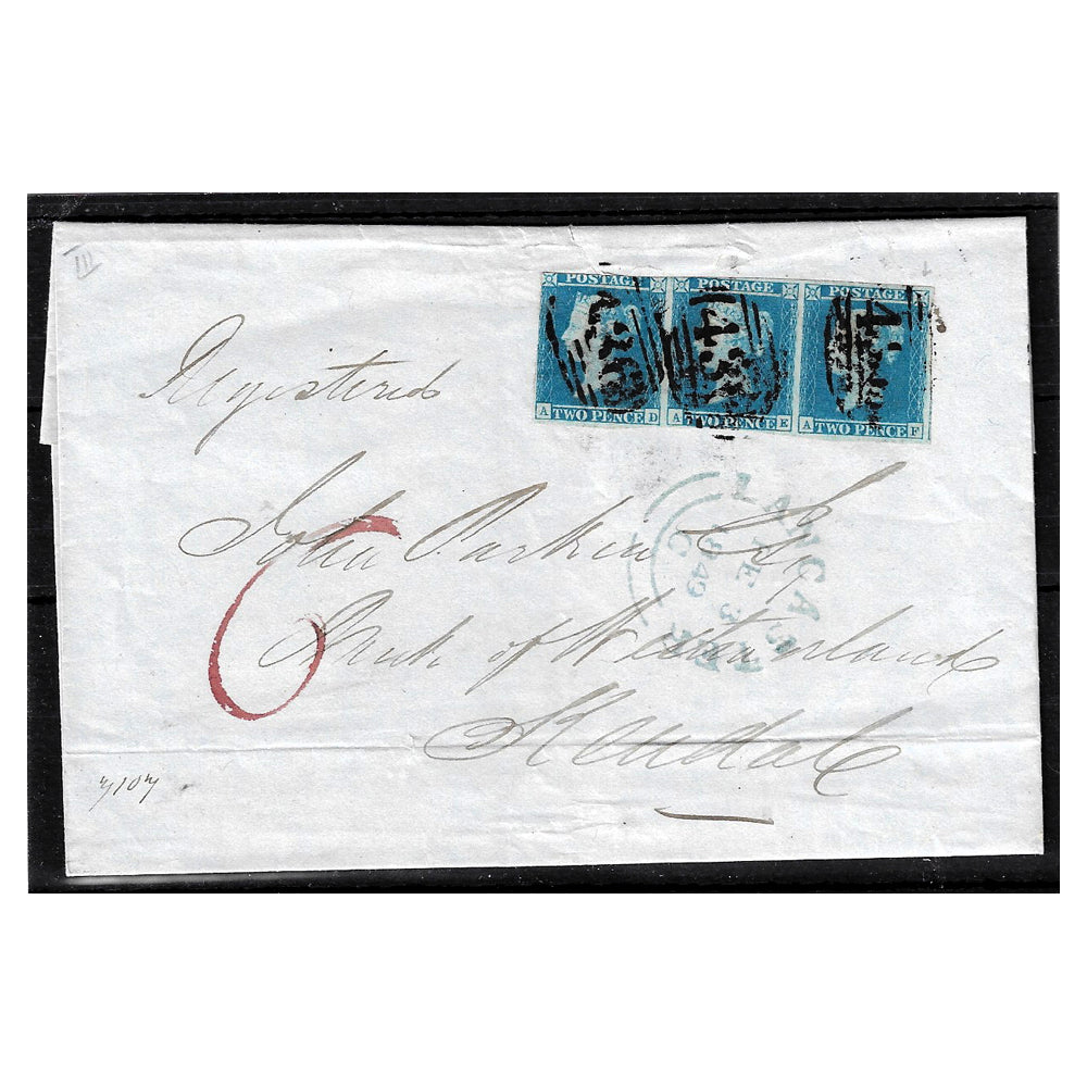 GB 1849 Strip of 3 x 2d pale-blue, used on cover to Kendal. SG13