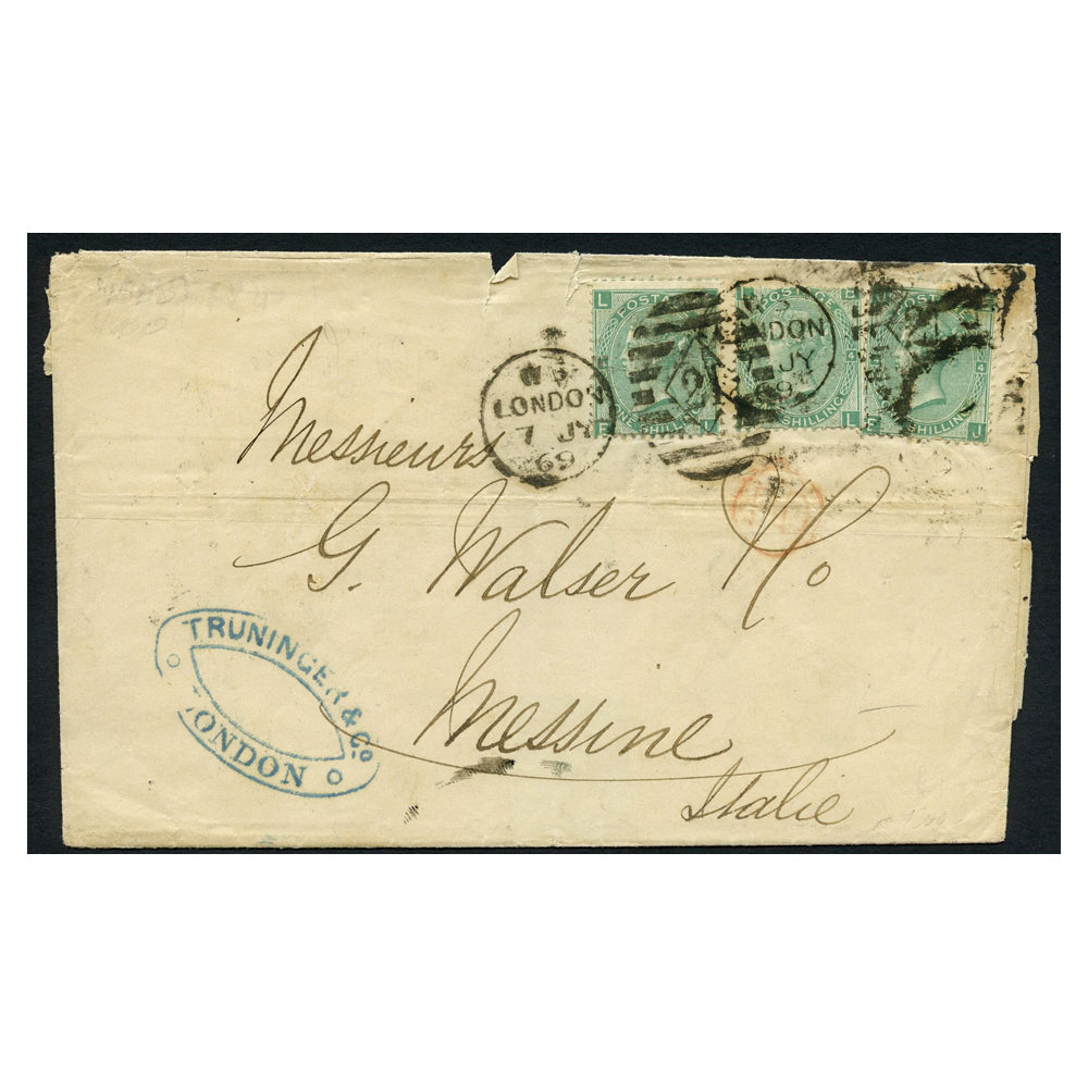GB 1869 1/- Green, pl 4, 3 examples used on cover from London to Messina (IT), unusual rate. SG117