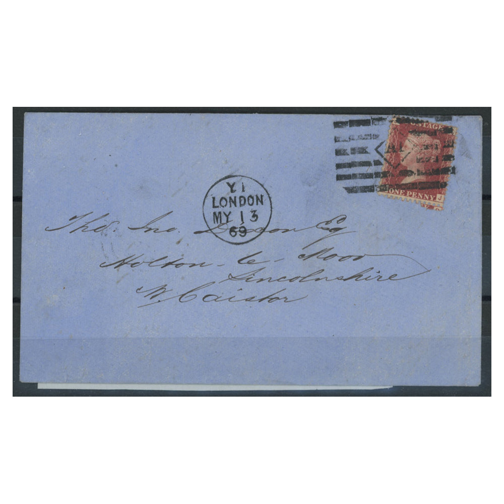 GB 1869 1d Lake-red, used on tidy cover, tied with in-period, experiemental Azemar cancel. SG44