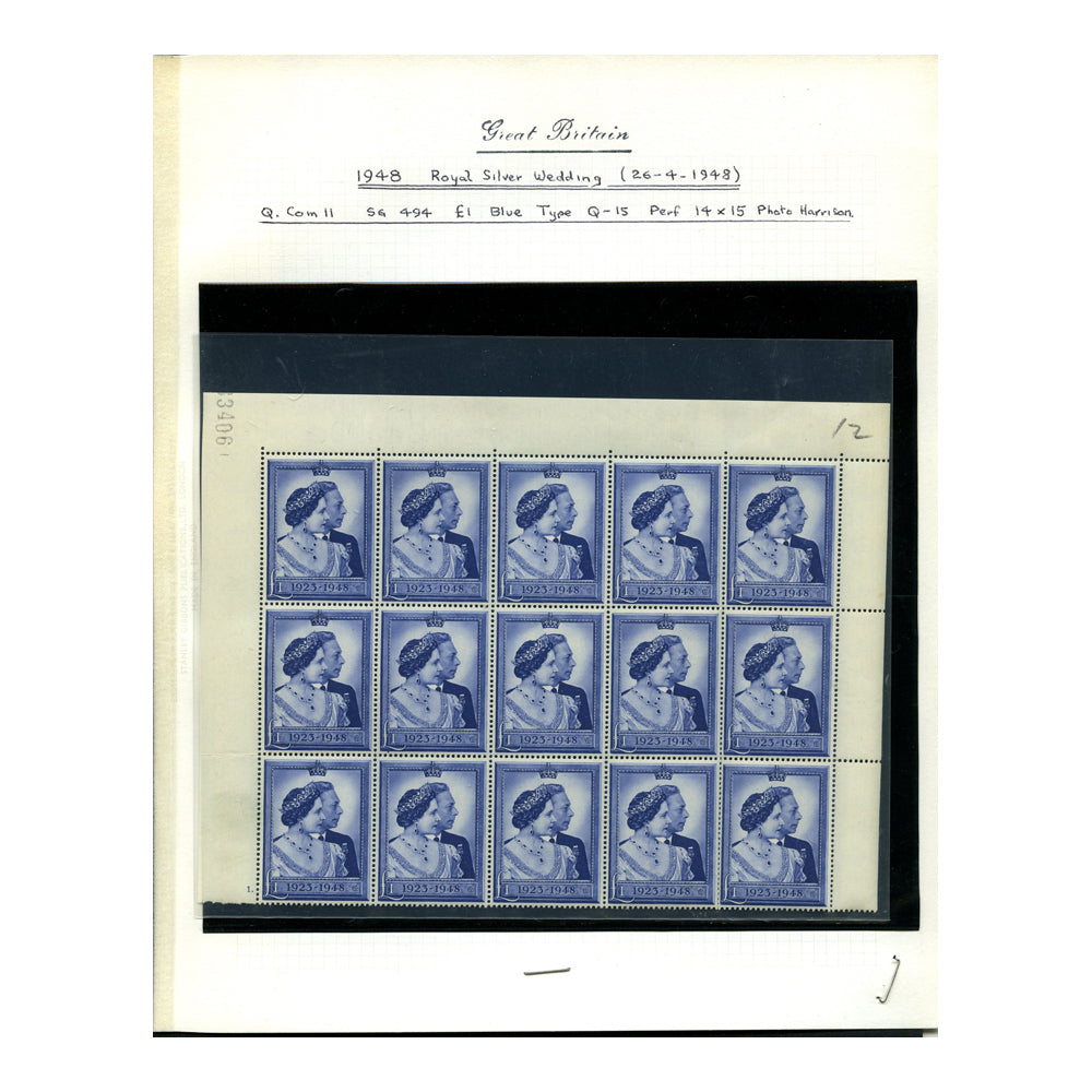 GB 1948 £1 Silver Wedding, 1/2 sheet (15 stamps) inc control & cyl (1) numbers, u/m. SG494