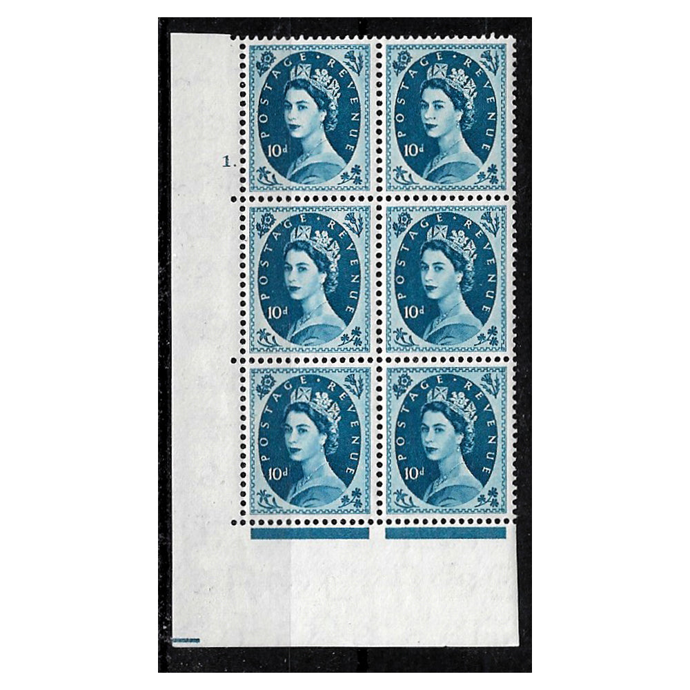 GB 1955 10d Prussian-blue (Edward), cyl 1, dot block of 6, u/m. SG552