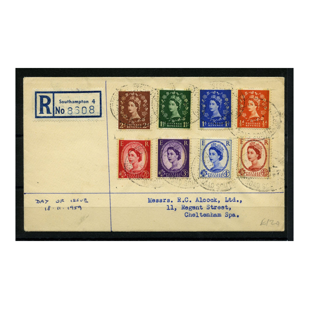GB 1959 Phosphor / graphite Wilding issue, used on registered plain FDC (rare on single). SG599-609