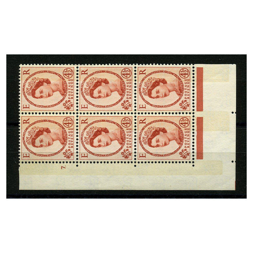 GB 1961-67 4-1/2d Chestnut, cyl 7 blk, on blued cream ppr, phos shift (near broad band), m/m. SG616b