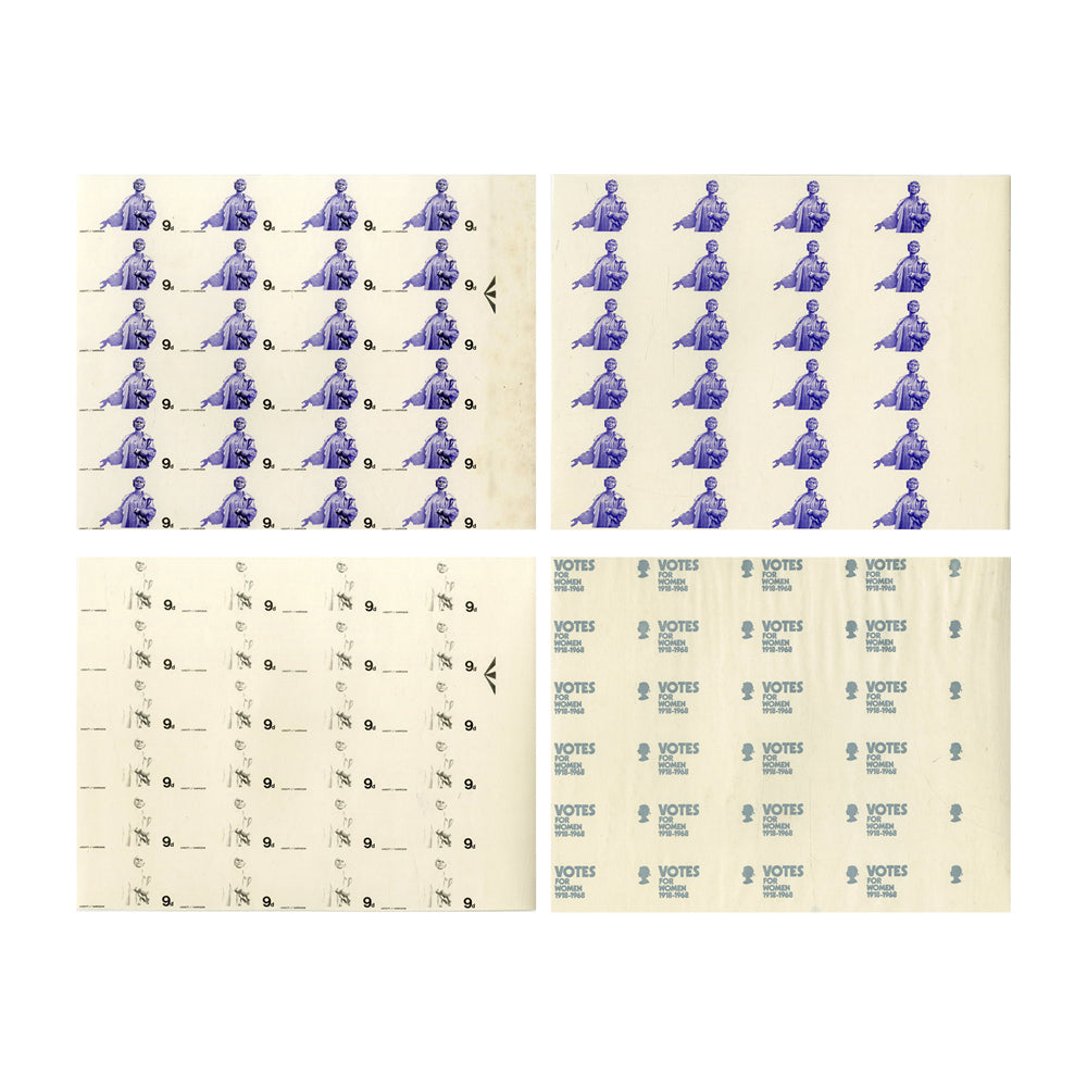 GB 1968 9d Votes for Women set of 4 progressive die-proof sheets of 24. Rare, possibly unique. SG768