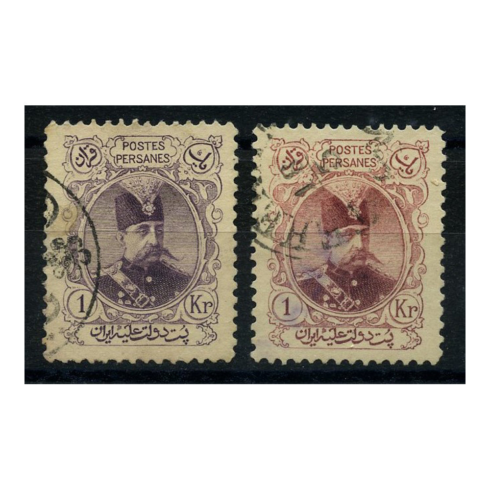 Iran 1903-04 1k Normal + claret-lake colour variety, both cds used. SG252+var
