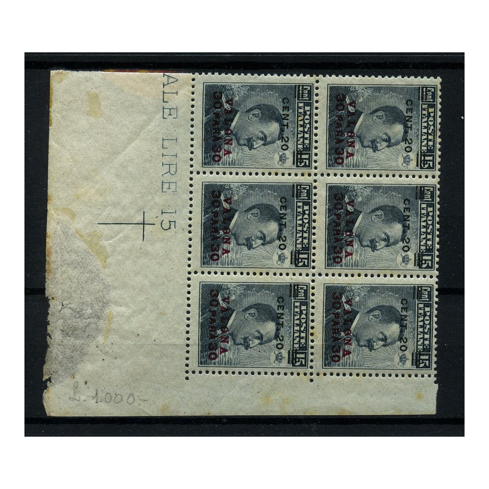 Italy (PO Turkey) 1916 20c On 30pa on 15c Valona, corner marg block of 6, u/m, minor gum tone. SG168