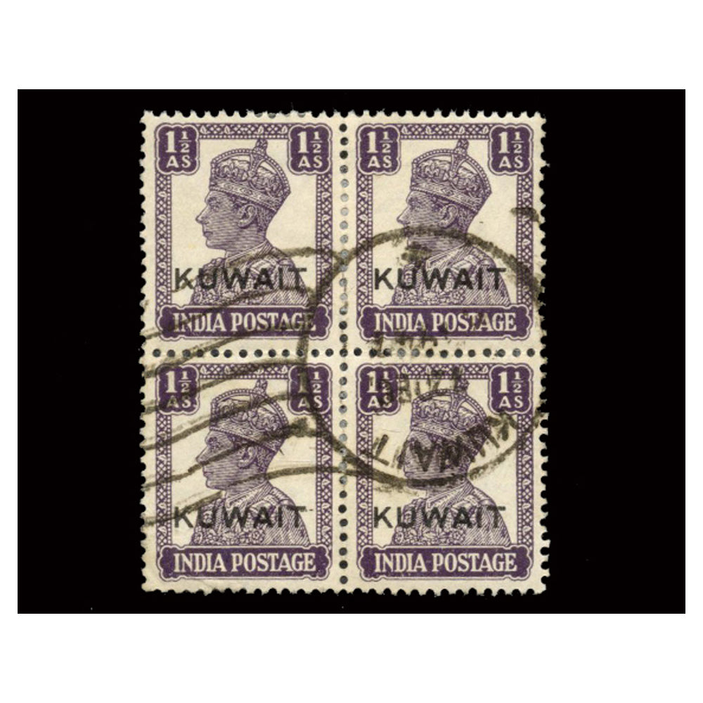 Kuwait 1945 1.5a Dull-violet ovpt definitive, block of 4, fine used. SG56