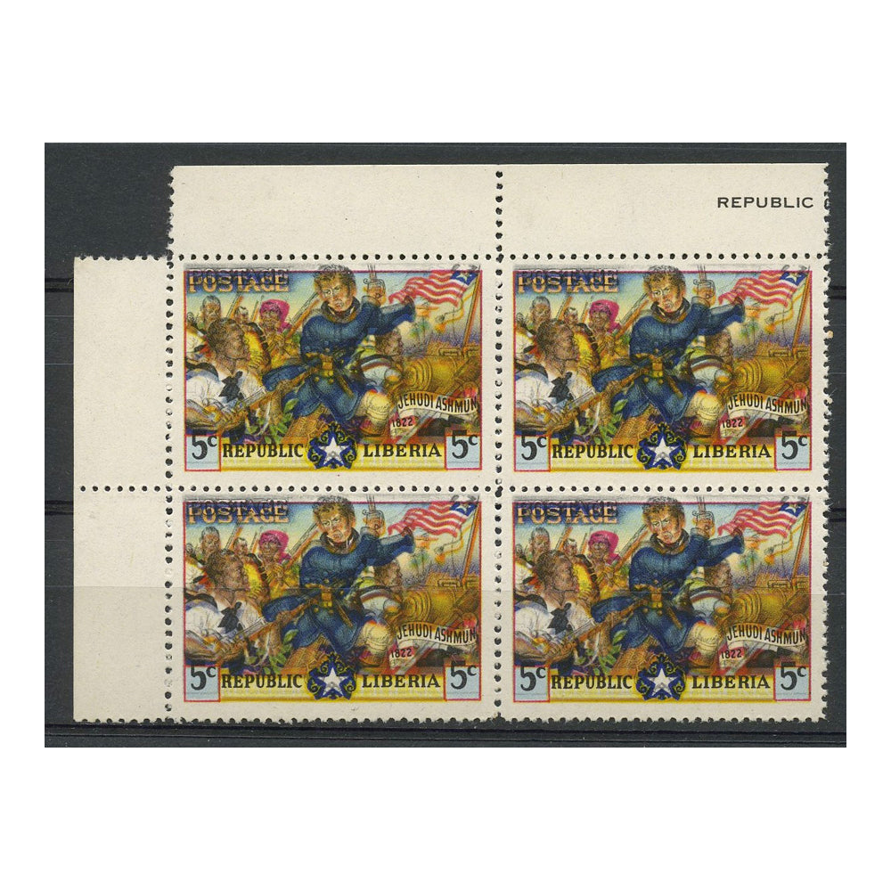 Liberia 1949 Jehudi Ashmun 5c MULTI-COLOUR SHIFT, fine u/m corner block of 4. SG705var
