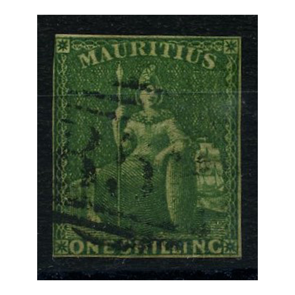 Mauritius 1861 1/- Yellow-green, fine used with 4 tight margins, attractive. SG35
