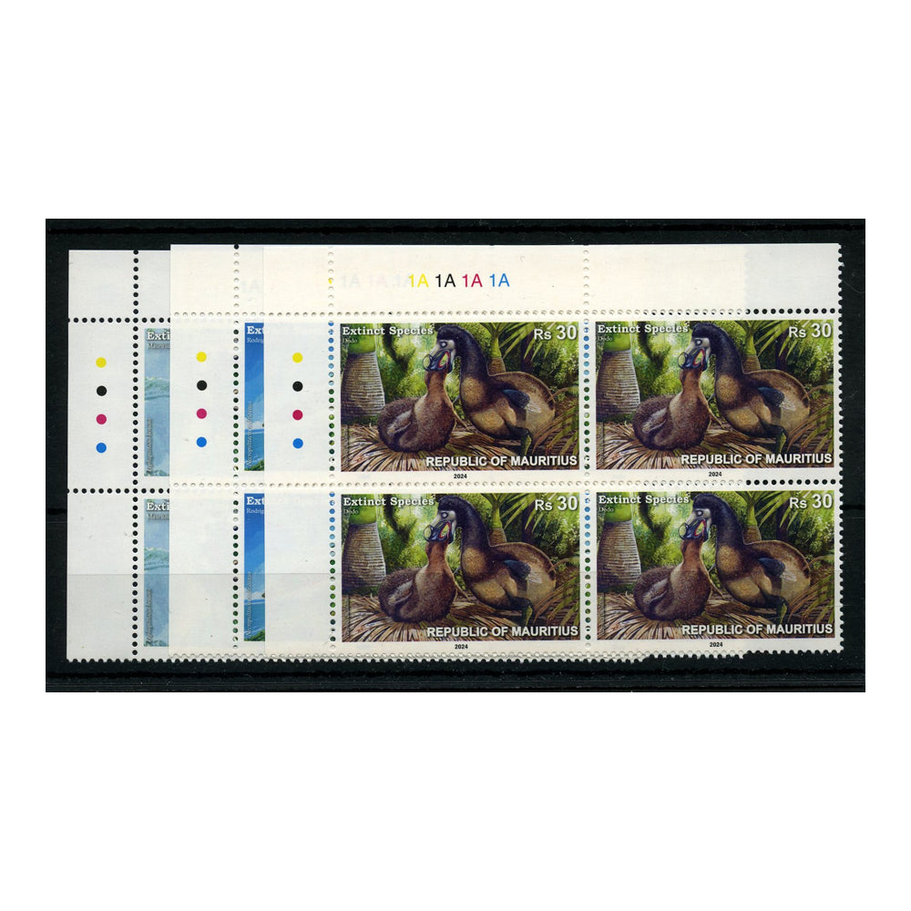 Mauritius 2024 Extinct birds (3v), in traffic light plate blocks of 4, u/m.