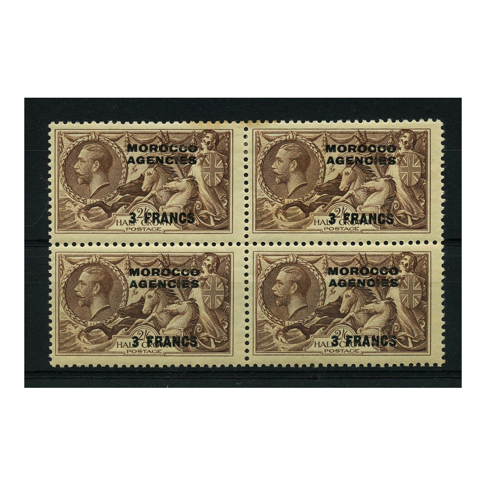 Mor Agncs 1935-36 3f On 2/6d Chocolate-brown, block of 4, mtd mint (top) & u/m, toned. SG225
