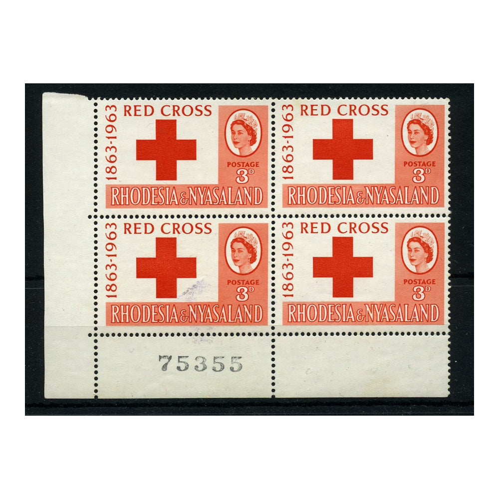Rhod & Nyas 1963 3d Red Cross corner marginal block of 4, with control number, u/m. SG47