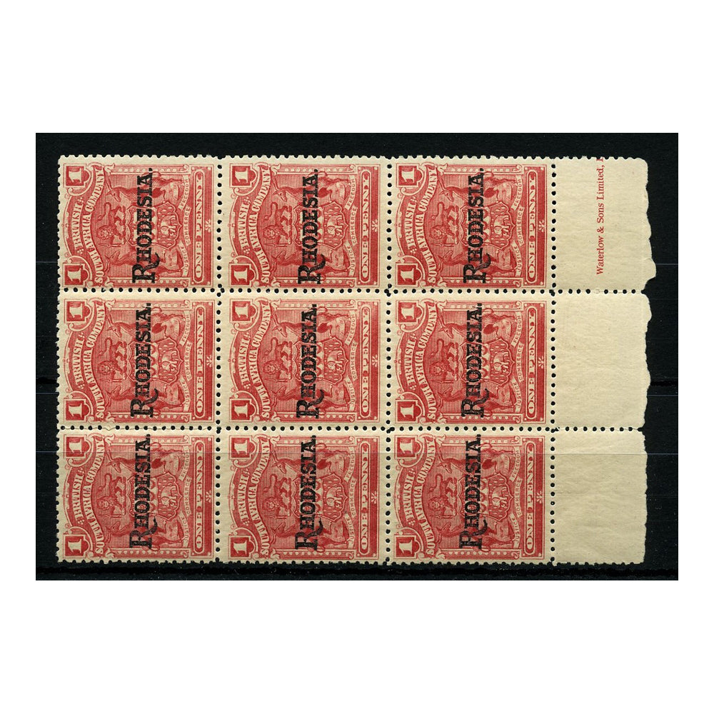 Rhodesia 1909-12 1d Carmine-rose, part marginal imprint block of 9, u/m. SG101