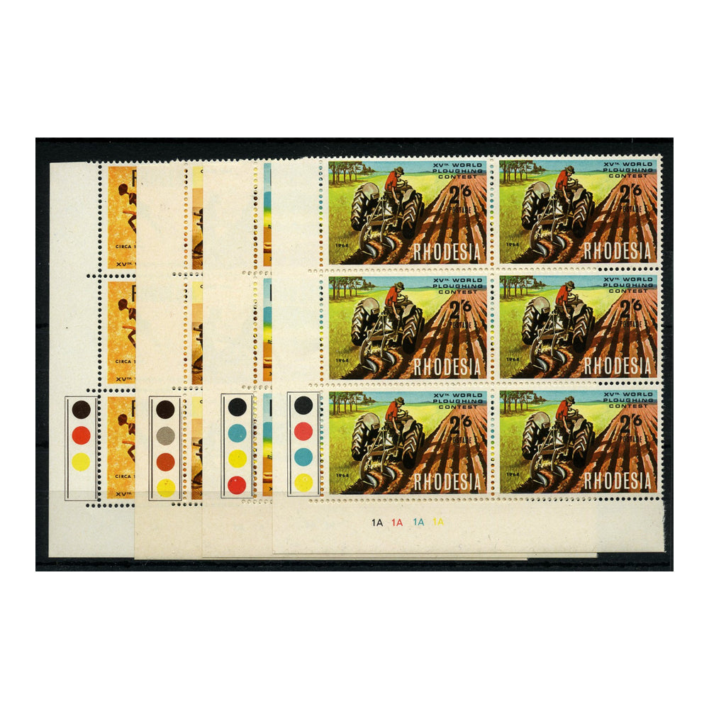 Rhodesia 1968 Ploughing contest, in 'traffic light' blocks of 6, u/m. SG422-25