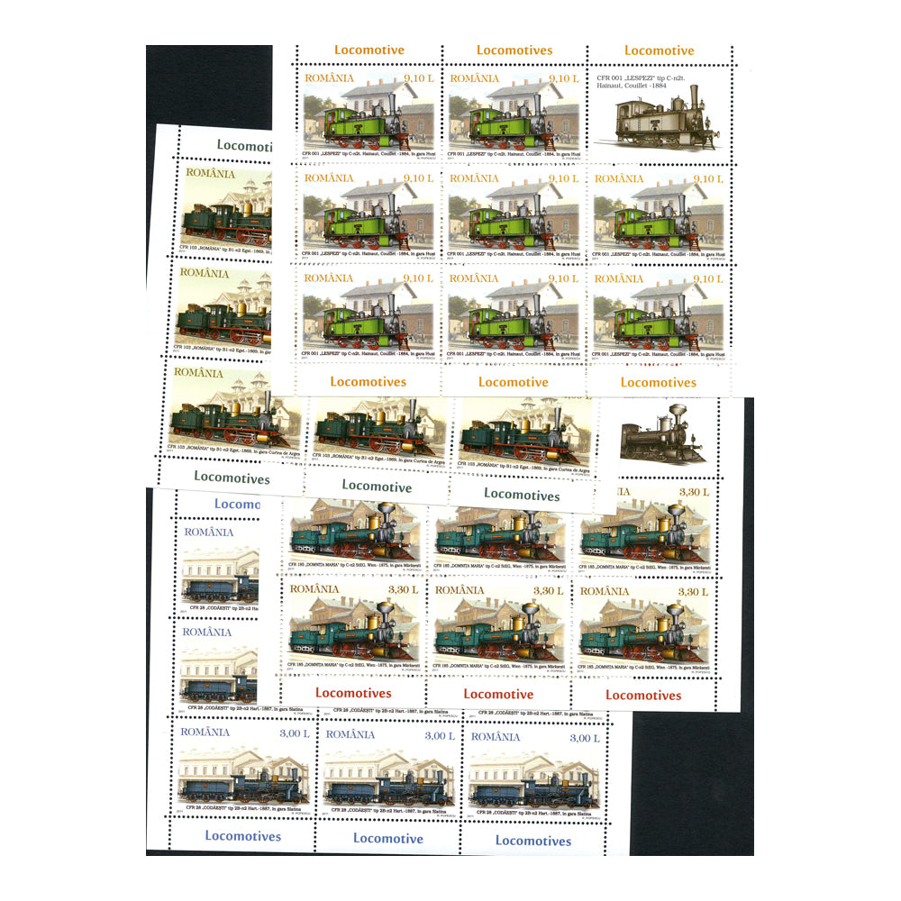 Romania 2011 Locomotives, u/m. SG7159-62 x 8+ label sheetlets