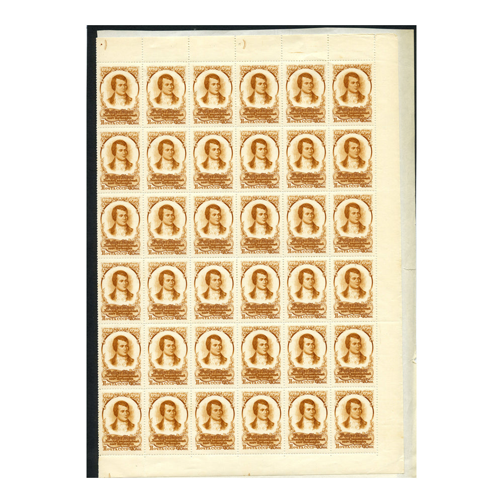 Russia 1956 40k Robert Burns, perf 12.5 x 12, complete sheet of 72, u/m. SG2001