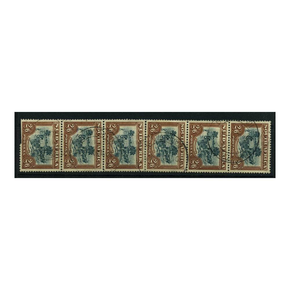 SA 1949-54 2/6d Green & brown, vert strip of 6 (3 pairs), fine cds used, SG121