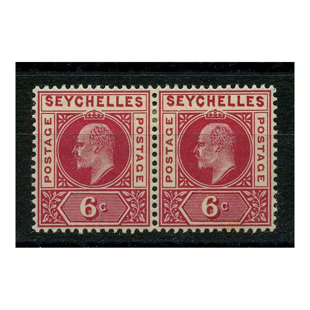 Seychelles 1903 6c Carmine, horiz pair displaying 'dented frame,' lightly mtd mint. SG48+a