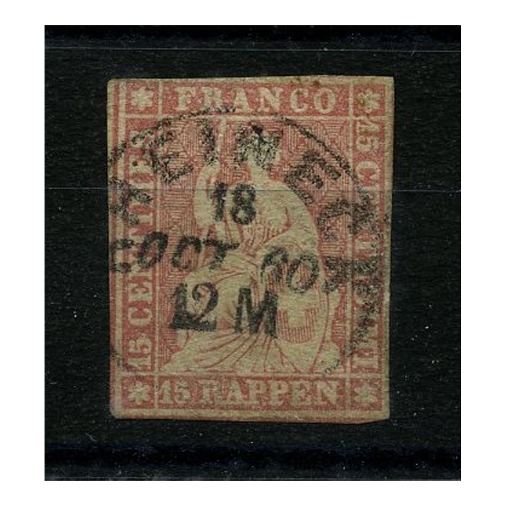 Switzerland 1858-62 15r Pale-rose, bright-green thread, cut close, cds used. SG49a