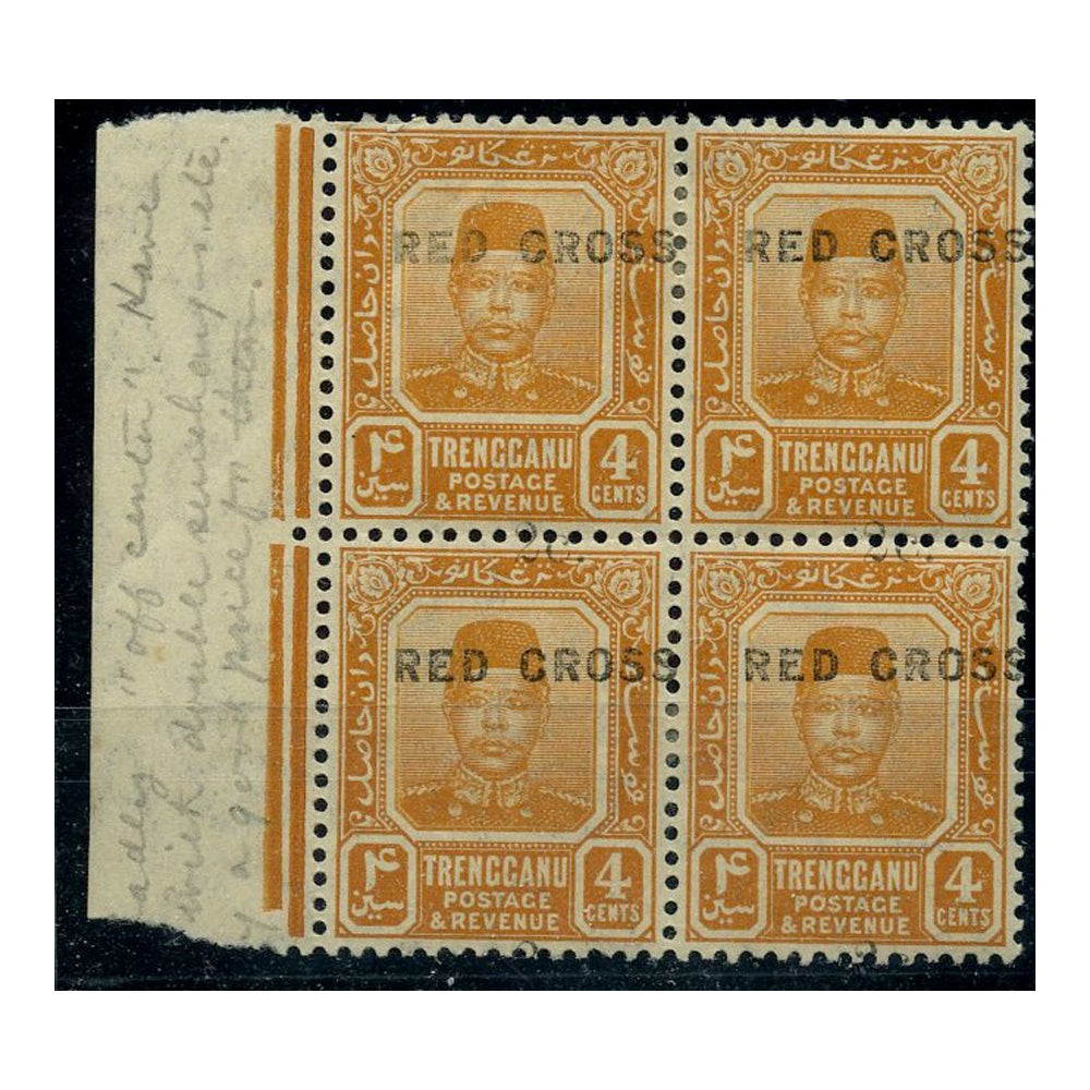 Trengganu 1917-18 Red Cross 2c on 4c orange surch misplaced, mtd mint block of 4, very scarce. SG20h