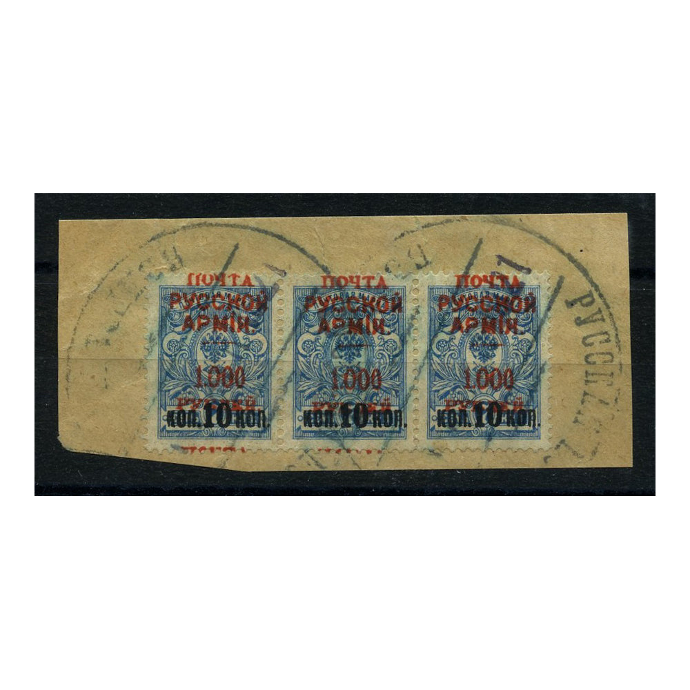 Wrangel Ref Post 1921 1000r on 10k on 7k Blue, horiz strip of 3, cds used (Belgrade) on frgmnt. SG13